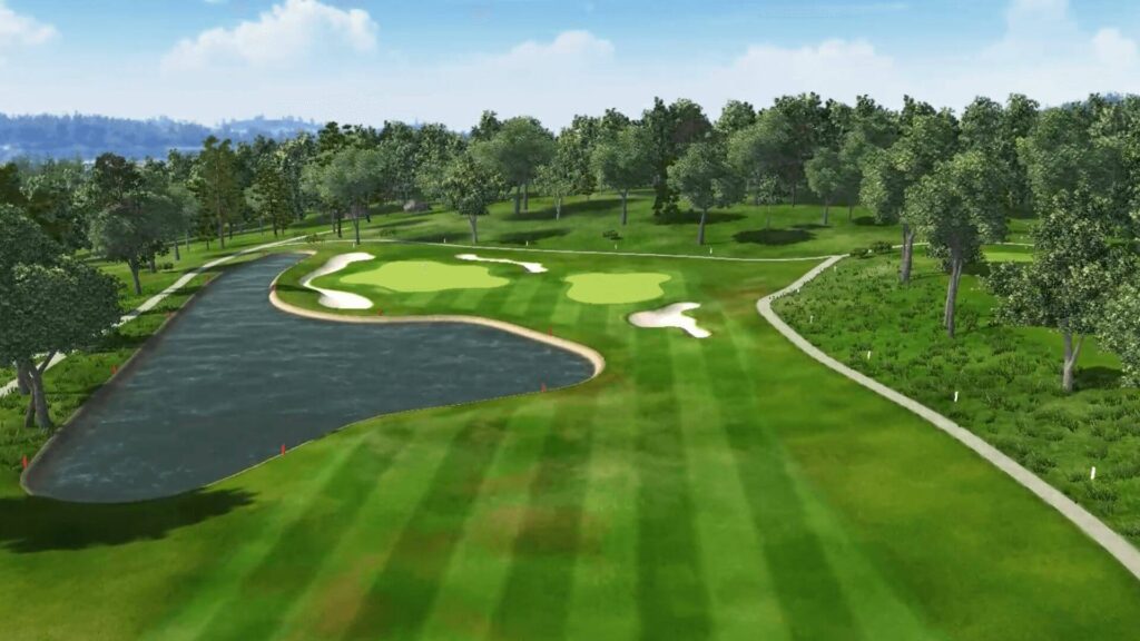 シミュレーションコースは、その再現性が非常に高いのが特徴です。木の位置やリアルな芝、バンカーの質感など細部まで忠実に再現されているため、実際の戦略を立てながら練習できる点が大きな魅力です。