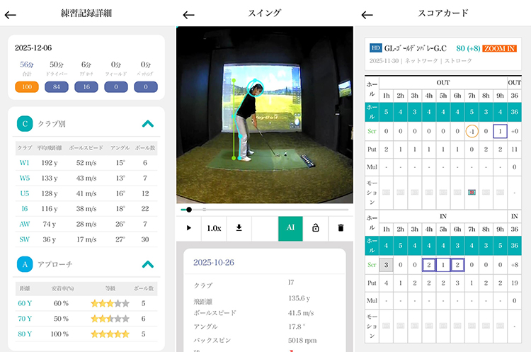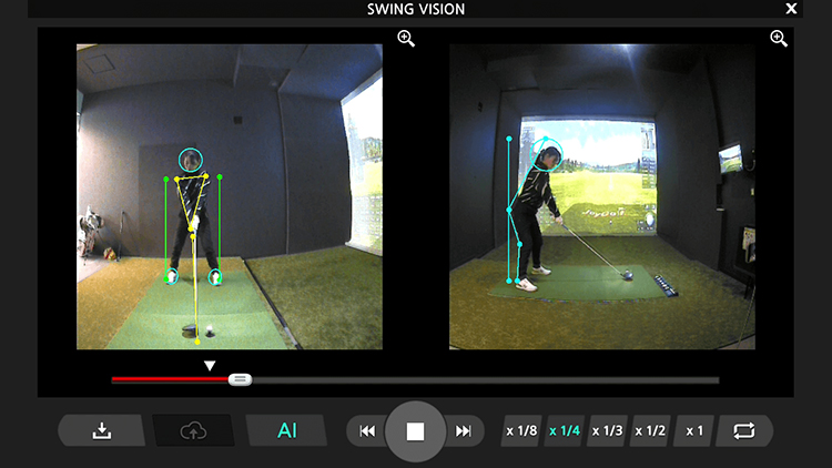 正面・側面の2方向からスイングを同時撮影し、AIが骨格を自動判定。アドレス時の補助線が自動表示され、理想フォームとのズレが瞬時にわかります。スロー再生やスマホ共有も可能で、成長を記録し続けられます。