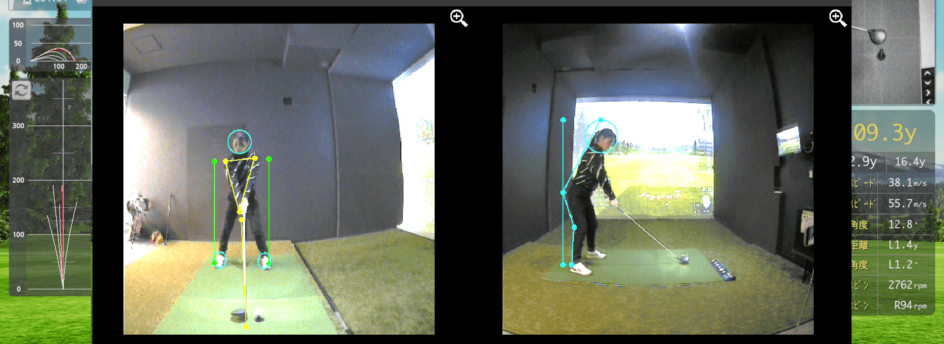 正面・側面の2方向からスイングを同時撮影し、AIが骨格を自動判定。アドレス時の補助線が自動表示され、理想フォームとのズレが瞬時にわかります。スロー再生やスマホ共有も可能で、成長を記録し続けられます。